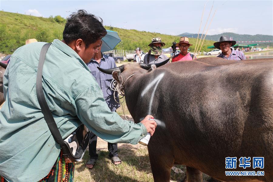 7月13日,在泰國(guó)春武里府賽牛節(jié)上,工作人員給參賽水牛噴涂號(hào)碼。新華社記者 張可任 攝