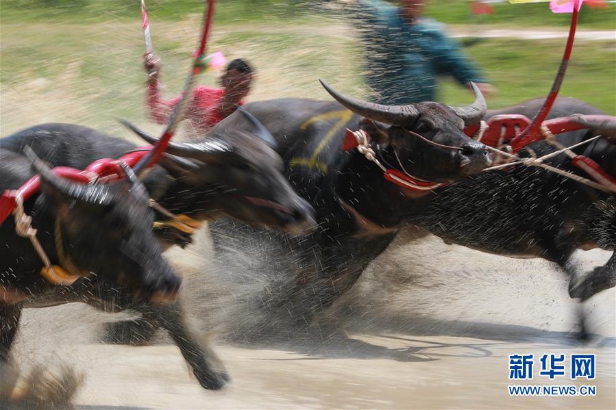 7月13日,在泰國(guó)春武里府賽牛節(jié)上,參賽者駕馭水牛參加比賽。新華社發(fā)(拉亨攝)