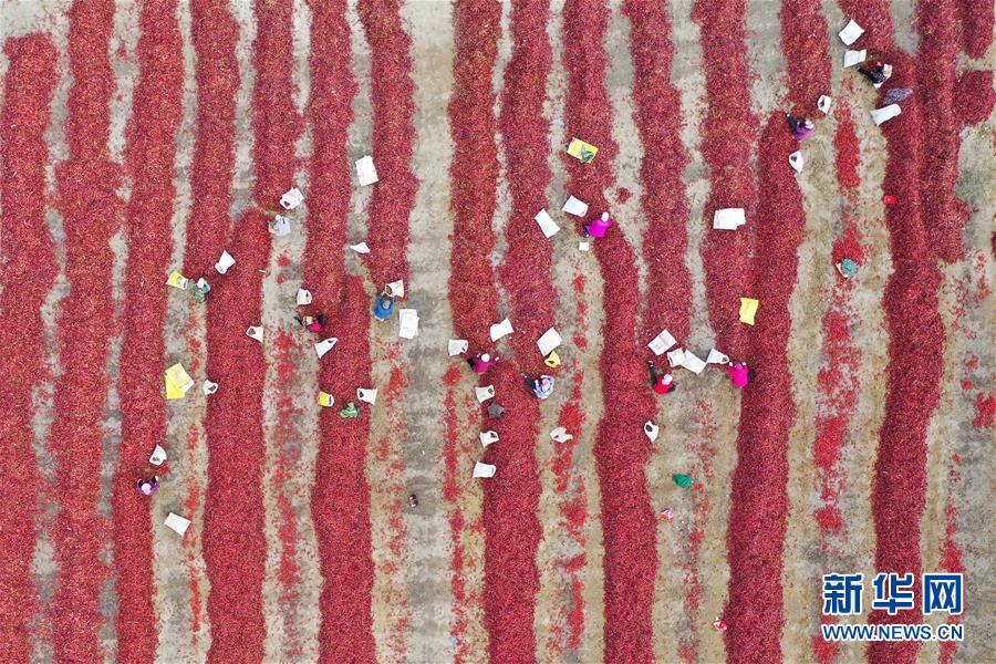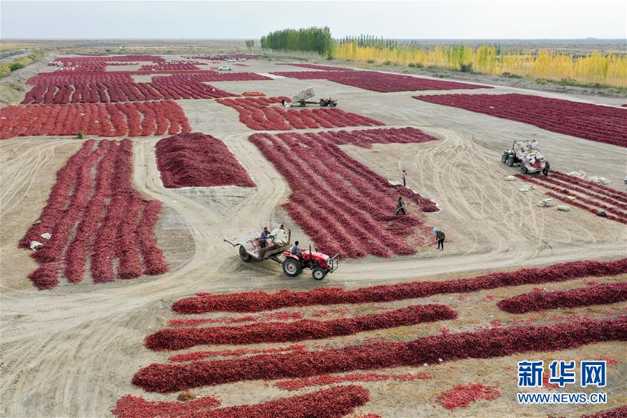 10月13日,在新疆博湖縣塔溫覺肯鄉(xiāng),農(nóng)民在晾曬辣椒(無人機拍攝)。時值深秋,新疆博湖縣11萬畝辣椒喜獲豐收。博湖是新疆有名的“辣椒之鄉(xiāng)”,這里種植的辣椒品質(zhì)優(yōu)良,深受國內(nèi)客商青睞。目前,種植辣椒已成為當?shù)剞r(nóng)民增收致富的支柱產(chǎn)業(yè)。新華社記者 丁磊 攝