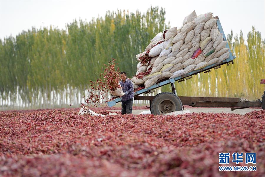 10月13日,在新疆博湖縣塔溫覺肯鄉(xiāng),農(nóng)民將采摘的辣椒晾曬。 新華社記者 丁磊 攝