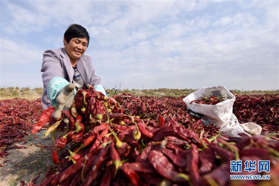 10月13日,在新疆博湖縣塔溫覺肯鄉(xiāng),農(nóng)民在晾曬辣椒。 新華社記者 丁磊 攝