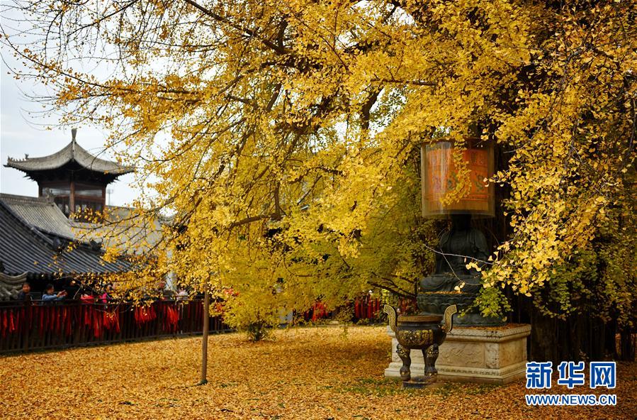 初冬時(shí)節(jié),陜西省西安市長安區(qū)羅漢洞村終南山古觀音禪寺內(nèi)的千年銀杏樹滿目金黃,落葉宛如金毯,吸引游客前來參觀游覽。新華社記者 劉瀟 攝