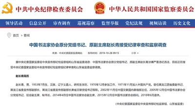 2019年10月28日,中央紀(jì)委國家監(jiān)委網(wǎng)站發(fā)布消息,中國書法家協(xié)會(huì)(下稱“中書協(xié)”)原分黨組書記、原副主席趙長青涉嫌嚴(yán)重違紀(jì)違法,目前正在接受調(diào)查。