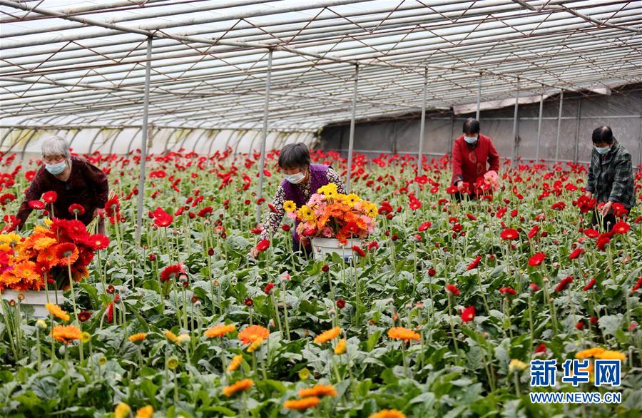 3月29日,在山東省棗莊市嶧城區(qū)榴園鎮(zhèn)富森扶貧花卉基地,村民在采摘鮮花。