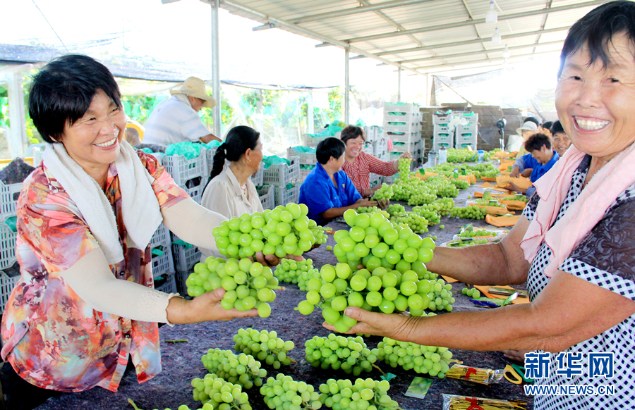 8月17日,安徽濉溪縣劉橋鎮(zhèn)任圩村扶貧產(chǎn)業(yè)園種植的葡萄喜獲豐收,工人們忙著將剛剛采摘的一串串葡萄稱(chēng)重、打包、裝箱,運(yùn)往外地。新華網(wǎng)發(fā)(周方玲 徐峰 攝)