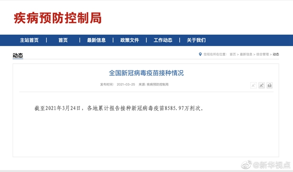 最大規(guī)模集中疫苗接種來了!國家衛(wèi)健委25日發(fā)布,截至2021年3月24日,各地累計(jì)報告接種新冠病毒疫苗8585.97萬劑次。