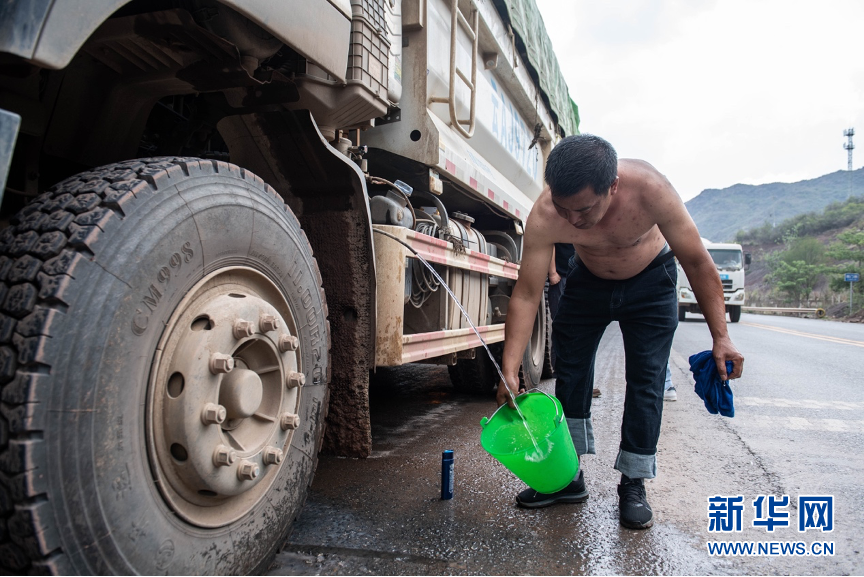 6月9日,一名渣土車司機在休息空檔洗頭、擦身。