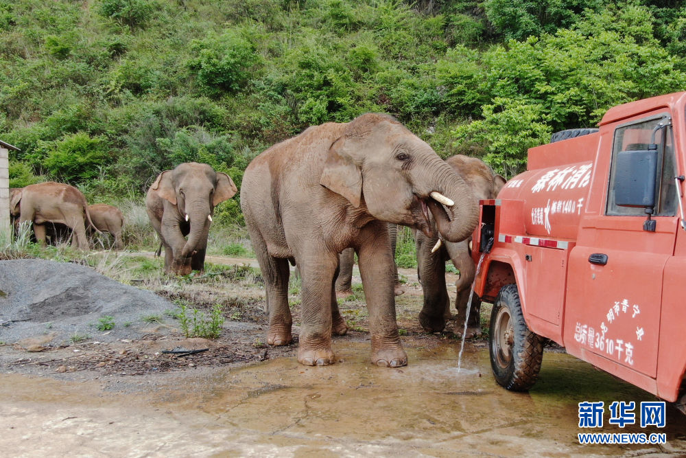 6月3日,消防車在昆明市晉寧區(qū)雙河彝族鄉(xiāng)為野象提供飲水。