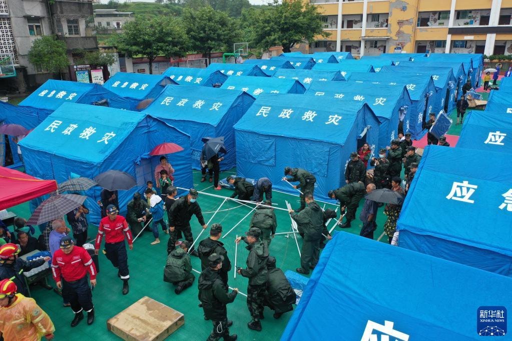 9月16日,武警四川總隊瀘州支隊官兵為受災(zāi)群眾搭建帳篷(無人機照片)。新華社發(fā)(張爽 攝) |