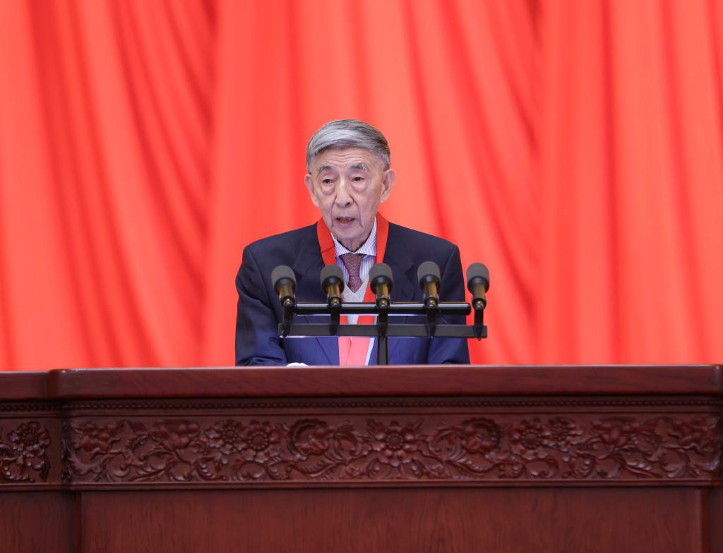 獲得2020年度國家最高科學(xué)技術(shù)獎的清華大學(xué)王大中院士代表全體獲獎人員發(fā)言。新華社記者 龐興雷 攝