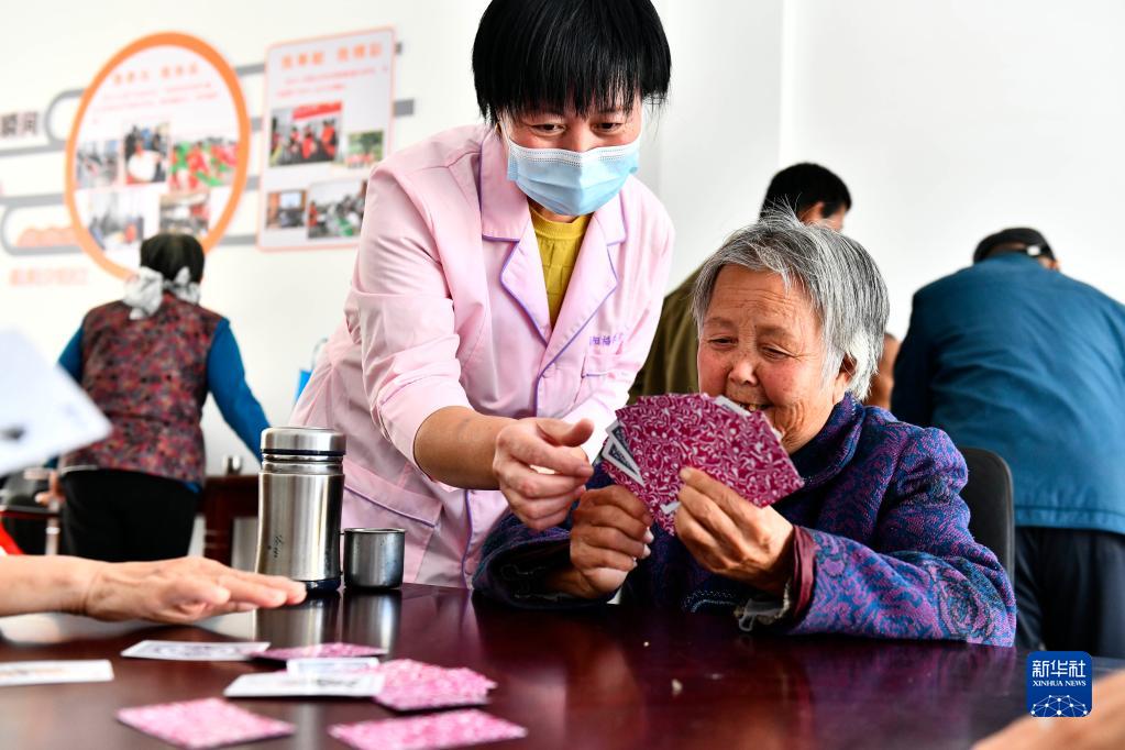 在山東省東營市墾利區(qū)楊廟社區(qū)養(yǎng)老服務(wù)中心,工作人員陪老人打撲克(10月18日攝)。新華社記者 郭緒雷 攝