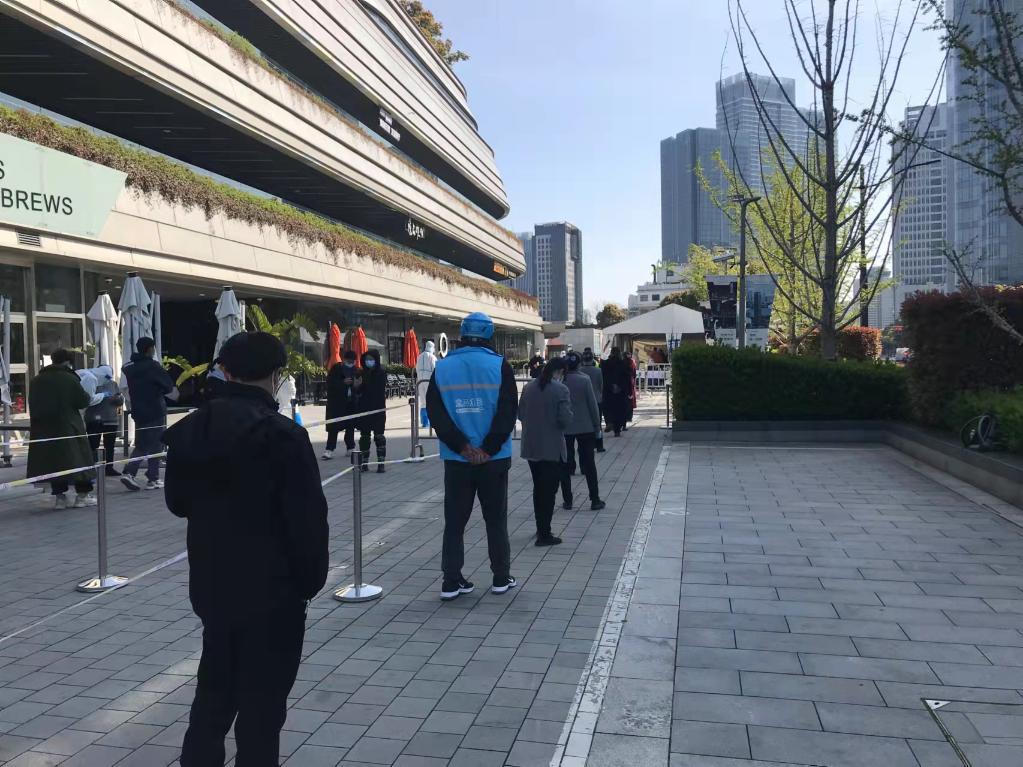 浦東新區(qū)東一居民區(qū),市民在排隊(duì)進(jìn)行核酸檢測。(新華社記者 丁汀攝)