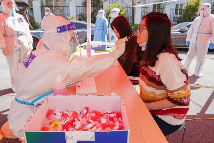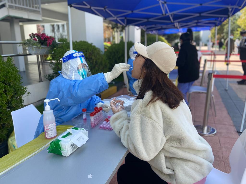 浦東新區(qū)東一居民區(qū),江蘇醫(yī)療隊(duì)隊(duì)員在為居民進(jìn)行核酸檢測。(新華社記者 丁汀攝)