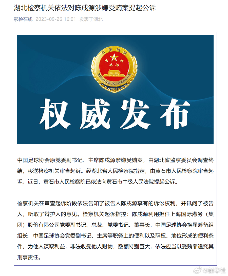 記者26日從湖北省人民檢察院獲悉,中國(guó)足球協(xié)會(huì)原黨委副書(shū)記、主席陳戌源涉嫌受賄案,由湖北省監(jiān)察委員會(huì)調(diào)查終結(jié),移送檢察機(jī)關(guān)審查起訴。經(jīng)湖北省人民檢察院指定,由黃石市人民檢察院審查起訴。近日,黃石市人民檢察院已依法向黃石市中級(jí)人民法院提起公訴。