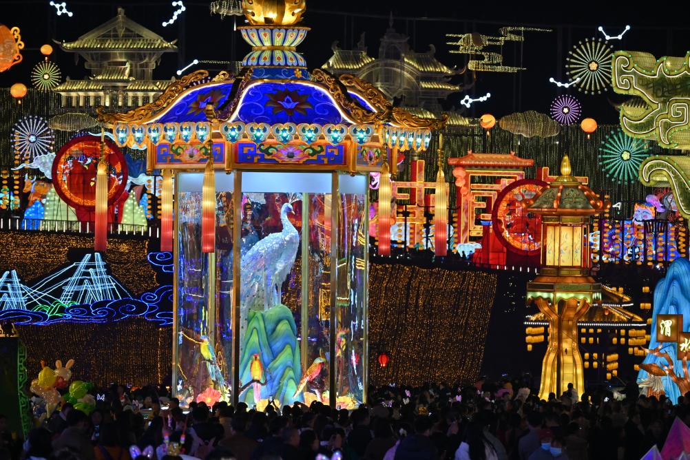 在四川自貢,3萬多名游客走進“中國燈城”自貢中華彩燈大世界,觀彩燈、賞演藝、拍全家福。空中,600架無人機排列出湯圓、舞龍燈等圖樣;地面,舞龍舞獅等民俗表演輪番上演,上百名身著漢服的演員手提花燈巡游……