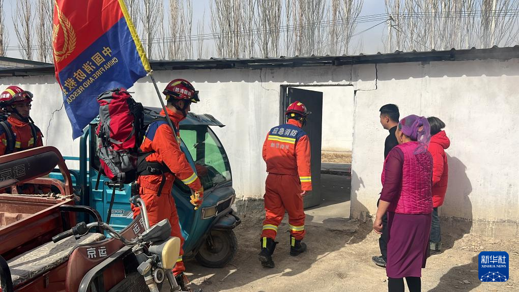2月25日,新疆克孜勒蘇柯?tīng)柨俗巫灾沃莅D什市交通路消防救援站指戰(zhàn)員深入附近村落開(kāi)展震后房屋排查。新華社發(fā)(肉孜買買提·艾山吐?tīng)?攝)