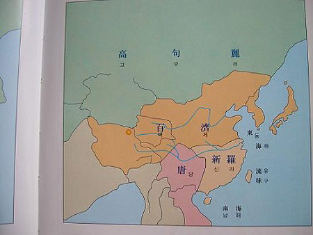 但在林均澤所著的《韓國(guó)史》標(biāo)記的地圖內(nèi)容卻與歷史相差甚大,書(shū)中中國(guó)地圖竟然用三種顏色分為三個(gè)國(guó)家:百濟(jì)、新羅和唐朝。其中的百濟(jì)除了統(tǒng)治整個(gè)朝鮮半島外,還統(tǒng)治中國(guó)華北和西藏,而上海、江蘇、浙江在內(nèi)長(zhǎng)江以南的中國(guó)區(qū)域則標(biāo)記著“新羅”,表示這是新羅的統(tǒng)治區(qū)。而云南、四川部分地區(qū),地圖中用紅顏色在這塊小小地區(qū)標(biāo)著“唐”。另外,該書(shū)的作者在描述三國(guó)割據(jù)結(jié)束后,統(tǒng)一的新羅王朝甚至還成立了安西都護(hù)府、安東都護(hù)府這樣的政府機(jī)構(gòu)。