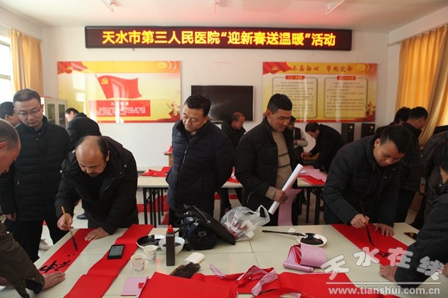 1月20日,正值2020年春節(jié)來臨之際,天水市第三人民醫(yī)院黨委副書記、院長李剛,黨委委員、副院長陳元前,黨委委員、紀委書記陳軍明及部分幫扶干部,前往武山縣沿安鄉(xiāng)高九村開展“迎新春送溫暖”慰問活動,給老黨員、貧困戶、五保戶送去了大米、食用油,給村民群眾現(xiàn)場書寫春聯(lián),為他們送上了暖暖的新春祝福和誠摯的問候。