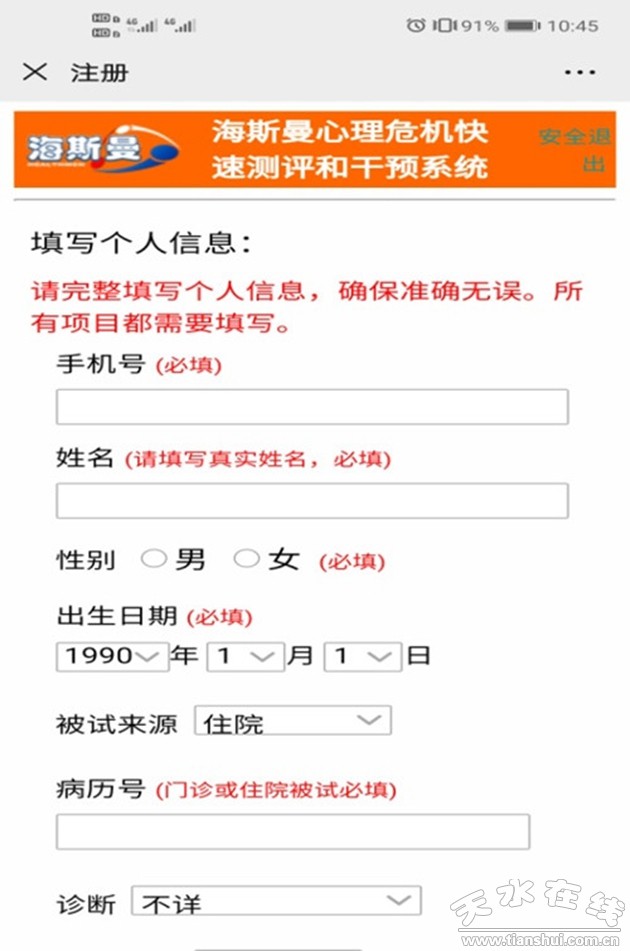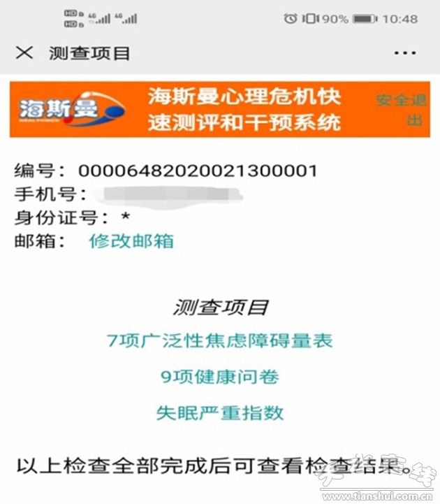 為了進(jìn)一步做好疫情防控時期的心理危機(jī)干預(yù)工作,為公眾提供及時、便捷、有效的心理干預(yù)服務(wù),消除大家對新型冠狀病毒感染肺炎的過度恐慌心理,天水市第三人民醫(yī)院、天水市心理危機(jī)干預(yù)中心聯(lián)合北京海斯曼科技有限公司,面向公眾免費(fèi)開放心理危機(jī)干預(yù)簡易測評系統(tǒng)。