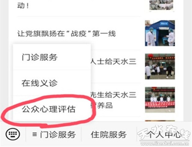 一、關(guān)注“天水市第三人民醫(yī)院”微信公眾號,進(jìn)入公眾號,門診服務(wù)-公眾心理評估平臺:
