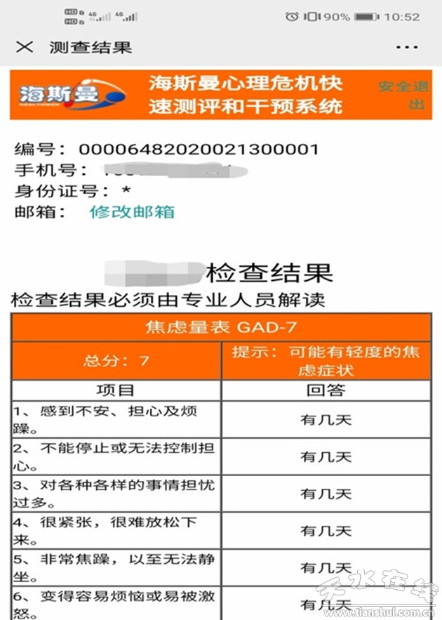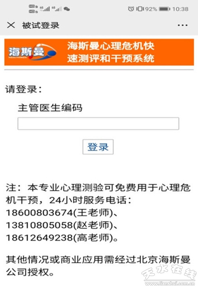 北京海斯曼科技有限公司針對疫情危機(jī)時期的公眾心理狀況,開發(fā)了心理危機(jī)干預(yù)簡易測評系統(tǒng)。天水市第三人民醫(yī)院、天水市心理危機(jī)干預(yù)中心在征得北京海斯曼公司同意后,現(xiàn)對公眾免費(fèi)開放該心理測評系統(tǒng),供大家無償使用。該系統(tǒng)能提供在線心理評估服務(wù),公眾可根據(jù)評估結(jié)果選擇通過我院24小時心理援助熱線(0938-8221199或12320-5-2)、在線義診平臺進(jìn)行一對一的心理危機(jī)干預(yù)服務(wù)。