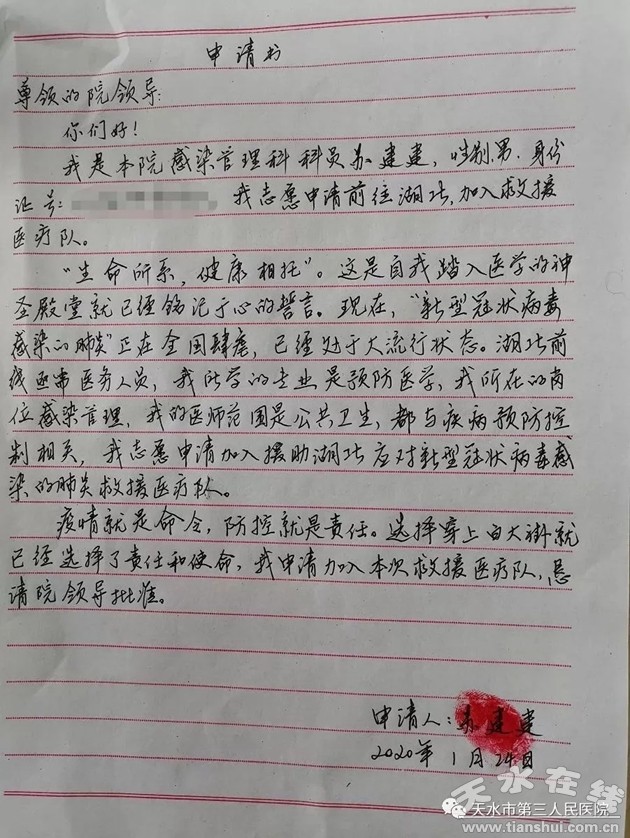 新冠肺炎疫情發(fā)生后,蘇建建同志積極響應(yīng)院黨委《致全院各黨支部和黨員的倡議書》,第一時(shí)間向醫(yī)院提出申請,主動(dòng)請戰(zhàn)到武漢抗擊疫情一線。他說:“現(xiàn)在,新型冠狀病毒感染的肺炎正在全國肆虐,已經(jīng)處在大流行狀態(tài)。我所學(xué)的專業(yè)是預(yù)防醫(yī)學(xué)專業(yè),我所在的崗位(是)感染管理,我的醫(yī)師范圍是公共衛(wèi)生,都與疾病預(yù)防控制有關(guān),(為此)我志愿申請加入援助湖北應(yīng)對新型冠狀病毒感染的肺炎救援醫(yī)療隊(duì)!睒銓(shí)的語言背后是他堅(jiān)定的信念。