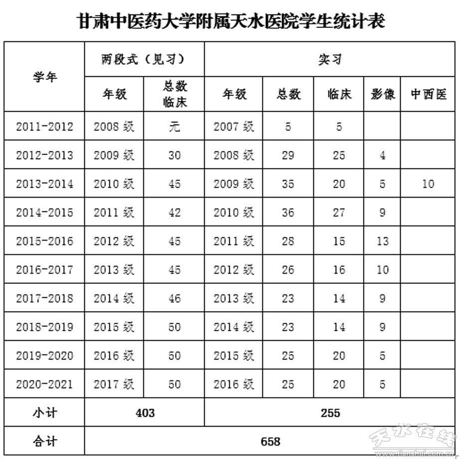 此次表彰大會(huì)極大地激勵(lì)了我院教師立德樹人、教書育人的信心和決心,也是對我院成為甘肅中醫(yī)藥大學(xué)附屬醫(yī)院以來,在教學(xué)工作上取得成績的極大肯定。我院自2011年開始接受第一批甘肅中醫(yī)藥大學(xué)實(shí)習(xí)生(共5人,臨床醫(yī)學(xué)專業(yè)),2012年5月與甘肅中醫(yī)學(xué)院簽訂協(xié)議,成為甘肅中醫(yī)學(xué)院非直屬附屬醫(yī)院,并掛牌“甘肅中醫(yī)學(xué)院附屬天水醫(yī)院”,截止目前,已接收10屆,共計(jì)658名甘肅中醫(yī)藥大學(xué)見/實(shí)習(xí)生,累計(jì)完成理論授課6960課時(shí)。