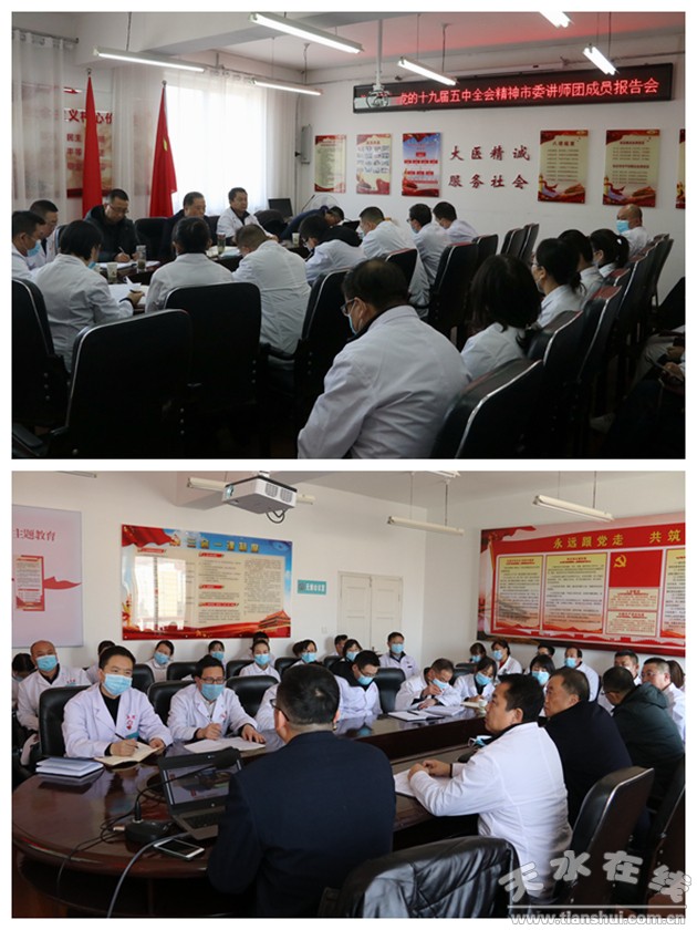 12月31日下午,為深入學(xué)習(xí)貫徹黨的十九屆五中全會精神,按照市委宣傳部《關(guān)于認真學(xué)習(xí)貫徹黨的十九屆五中全會精神全市集中宣講工作方案的通知》精神,天水市第五人民醫(yī)院黨總支召開學(xué)習(xí)貫徹黨的十九屆五中全會精神報告會。報告會邀請?zhí)焖形v師團成員、天水師范學(xué)院馬克思主義學(xué)院副院長余明遠教授作宣講報告。余明遠教授以“實現(xiàn)人民幸福是中國共產(chǎn)黨治國理政的根本價值追求”為題進行了宣講,會議由黨總支副書記、副院長馬茂忠主持,醫(yī)院全體黨員、科級干部及負責人共40余人參加了報告會。