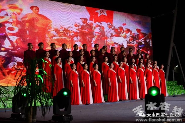 本場晚會以全院8個黨支部和天水四零七康復(fù)醫(yī)院、隴南四零七醫(yī)院為單位分別組隊演出。10支隊伍以合唱的形式深情唱響黨的百年贊歌,熱情謳歌黨的光輝業(yè)績,真情頌揚黨的無限恩情!吨袊娀辍、《革命人永遠是年輕》、《十送紅軍》以及詩與歌《破曉的曙光》、《戰(zhàn)地軍歌》表達了硝煙彌漫的戰(zhàn)爭年代,革命先烈沖鋒在前,拋頭顱灑熱血,英勇戰(zhàn)斗,不怕犧牲的革命精神!陡伯a(chǎn)黨走》、《迎風(fēng)飄揚的旗》、《我的祖國》、《我們走在大路上》、《向往》、《復(fù)興的力量》、《走向復(fù)興》等節(jié)目彰顯了黨領(lǐng)導(dǎo)我們凝心聚力、砥礪奮進,昂首闊步踏上民族復(fù)興之路,筑夢新時代的壯志豪情。