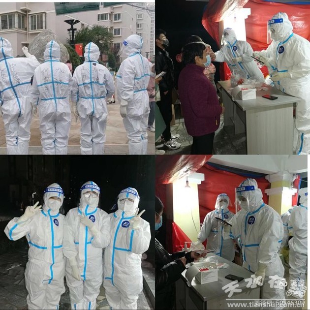 11月1日下午,醫(yī)院緊急通知增加大規(guī)模核酸采樣隊(duì)隊(duì)員,心二科劉小桂,李旦,王麗麗,何雪燕在接到電話通知后,迅速整理裝備和生活用品,半小時(shí)內(nèi)準(zhǔn)時(shí)抵達(dá)集合點(diǎn)。她們中劉小桂、王麗麗、何雪燕家中都有剛滿一歲、嗷嗷待哺的孩子,但在危難面前,她們舍棄小家顧全大家,義不容辭地加入到了這場(chǎng)沒(méi)有硝煙的戰(zhàn)爭(zhēng)中。領(lǐng)取完物資后,她們立刻投入到山水新城小區(qū)的核酸采樣工作,山水新城屬于秦州區(qū)大型小區(qū),常住人口多,工作量大,當(dāng)日的采樣工作直到凌晨才結(jié)束。