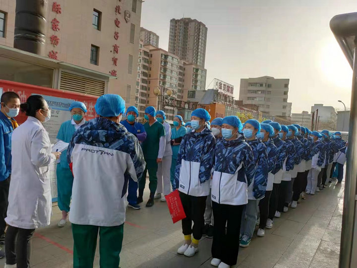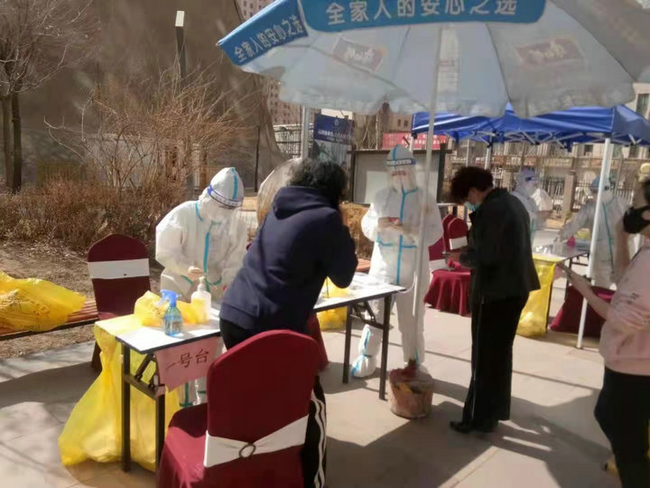 到達(dá)工作地點(diǎn),社區(qū)的工作人員已經(jīng)為我們配備好了工作物資。組長耐心細(xì)致的重復(fù)著工作流程,看著我們穿好防護(hù)服、檢查密閉性,在防護(hù)服背后寫上單位和名字之后,隨后立即投入工作。眼前長龍一樣的隊(duì)伍,是我們支援蘭州這些天面臨的常態(tài)。