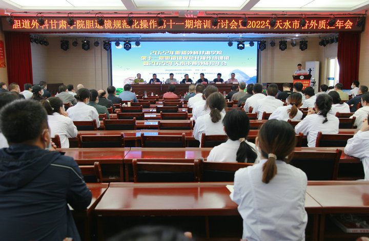 5月28日,由甘肅省醫(yī)師協(xié)會膽道外科醫(yī)師委員會、甘肅省人民醫(yī)院及膽道外科甘肅學院主辦,天水市普通外科質量控制中心、天水市第二人民醫(yī)院承辦的“膽道外科甘肅學院第十一期膽道鏡規(guī)范化操作培訓班暨2022年天水市普外質控年會”在市二院召開。會議特邀甘肅省膽道外科奠基人、蘭州大學第二人民醫(yī)院李徐生教授,甘肅省醫(yī)師協(xié)會秘書長滕貴明教授,甘肅省醫(yī)師協(xié)會膽道外科醫(yī)師委員會前任主委、甘肅省人民醫(yī)院高鵬教授,甘肅省醫(yī)師協(xié)會膽道外科醫(yī)師委員會現任主委、甘肅省人民醫(yī)院楊曉軍教授,甘肅省醫(yī)師協(xié)會膽道外科醫(yī)師委員會候任主委、蘭州大學第二人民醫(yī)院徐小東教授,甘肅省醫(yī)師協(xié)會膽道外科醫(yī)師委員會副主委、甘肅省中醫(yī)院唐曉勇教授等多位省內知名膽道外科專家、學者蒞臨會場并做專題演講。會議由市二院副院長高國明主持,院長唐志鋒致歡迎詞。