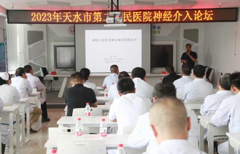 為進一步推進醫(yī)院卒中中心建設(shè),持續(xù)推動“三抓三促”行動走深走實,6月8日,天水市第二人民醫(yī)院在內(nèi)科大樓14樓會議室舉辦神經(jīng)介入前沿診療技術(shù)論壇。特邀國內(nèi)知名專家、陜西省咸陽市第一人民醫(yī)院神經(jīng)內(nèi)科袁興運教授、西電集團醫(yī)院神經(jīng)內(nèi)科姚力教授和市二院副院長高國明出席會議。會議由市二院腦血管介入科田建平主任主持。神經(jīng)內(nèi)科、神經(jīng)外科、介入科、急診科、康復(fù)科和重癥醫(yī)學(xué)科醫(yī)護人員約80余人參加了論壇。