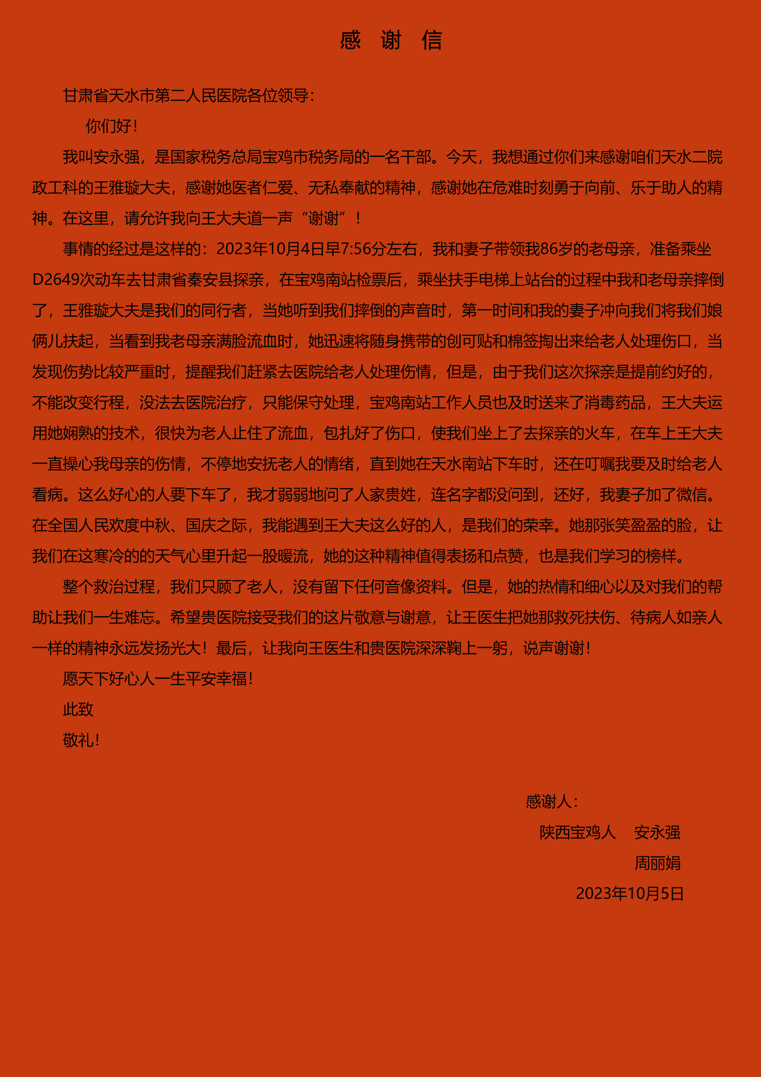 近日,天水市第二人民醫(yī)院收到一封國(guó)家稅務(wù)總局寶雞市稅務(wù)局一名干部安永強(qiáng)和他妻子發(fā)來(lái)的感謝信。對(duì)方在電話中連連道謝,感謝市二院公共衛(wèi)生科職工王雅璇在國(guó)慶休假旅游期間施以援手,及時(shí)為摔傷老人處理傷口,并一路安慰問(wèn)候。