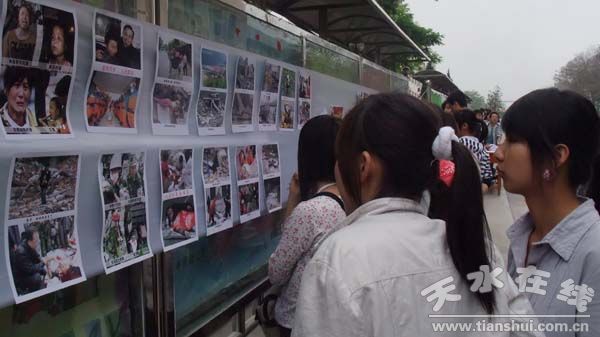 在各個(gè)活動(dòng)場上,信息系青年志愿者、環(huán)保協(xié)會(huì)、晨曦文學(xué)社等學(xué)生組織舉辦的“汶川大地震圖片展”吸引了不少師生駐足觀看,在那一幕幕的撕人心扉的圖片前,有人默默地祈福,也有人默默地流淚……在“紀(jì)念5.12一周年愛心傳遞活動(dòng)”橫幅上,師生們鄭重簽上了自己名字,表達(dá)了對(duì)罹難同胞的無限哀思!