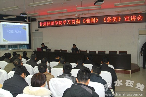 12月21日上午, 甘肅林職學院學習貫徹《中國共產(chǎn)黨廉潔自律準則》和《中國共產(chǎn)黨紀律處分條例》宣講會在綜合樓114室舉行。院長陳逸平、副院長姚德生、虎保成、冉福祥出席,全體中層干部參加。宣講會由黨委書記高云峰主持。