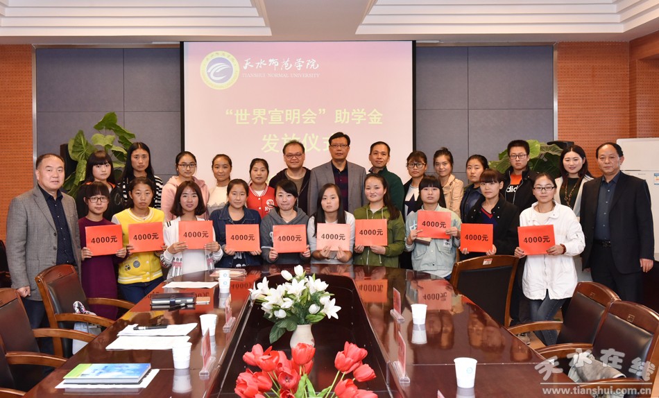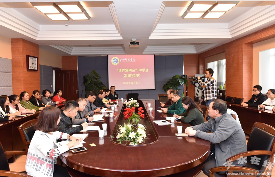 10月20日下午,世界宣明會資助天水師范學(xué)院2015級貧困大學(xué)生資助金發(fā)放儀式在行政樓412會議室舉行。世界宣明會中國辦事處甘肅片區(qū)經(jīng)理彭國才、武山項目辦經(jīng)理李偉儉等一行四人出席儀式,學(xué)校學(xué)生工作處、教師教育學(xué)院相關(guān)負(fù)責(zé)人參加儀式。儀式由助學(xué)管理中心主任劉正主持。