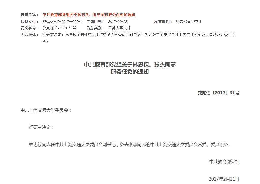 舉個例子。今年2月23日上午,上海交通大學舉行全校教師干部大會,中組部干部三局巡視員、副局長鐘海東在會上宣讀了中共中央、國務院的任免決定,林忠欽任上海交通大學校長。但其實就在兩天前,教育部官網(wǎng)已經(jīng)掛出了一條職務任免通知,林忠欽任中共上海交通大學委員會副書記,相對而言,這條副書記的任命消息更為低調。