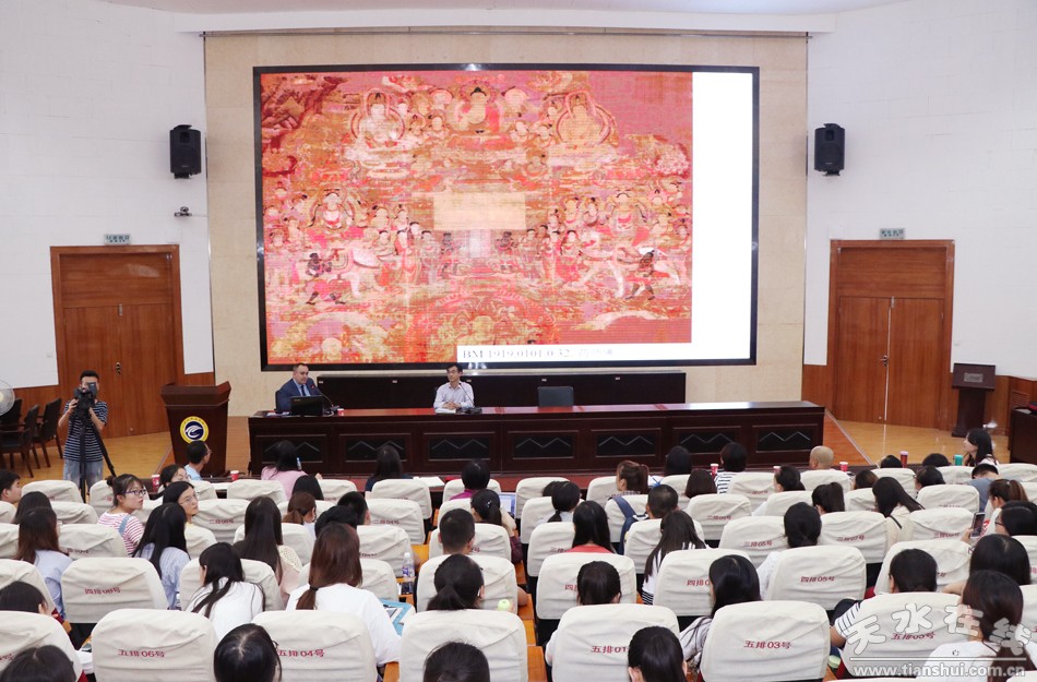 研討會期間,劍橋大學(xué)Imre Galambos(高奕睿)教授和上海大學(xué)陳勇教授分別做客我校文學(xué)與文化傳播學(xué)院“名家大講堂”作了題為“九至十世紀(jì)敦煌的書寫與文化身份”、“圖像研究例說:關(guān)于‘蓮臉’、‘睡姿美人’的圖像分析”的學(xué)術(shù)報告。部分參會人員和我校部分教師、研究生、本科生及國培學(xué)員700多人現(xiàn)場聆聽了講座并進(jìn)行了互動交流。