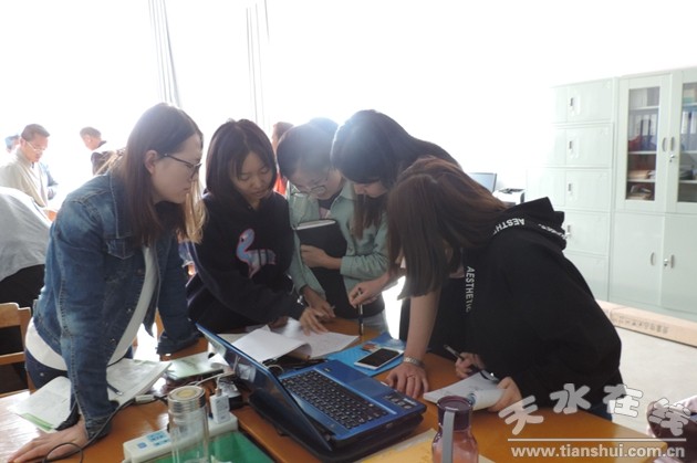 (凌單丹、陳亞亞、周婭瓊、李家雯、屈丹妮同學(xué)討論教學(xué))