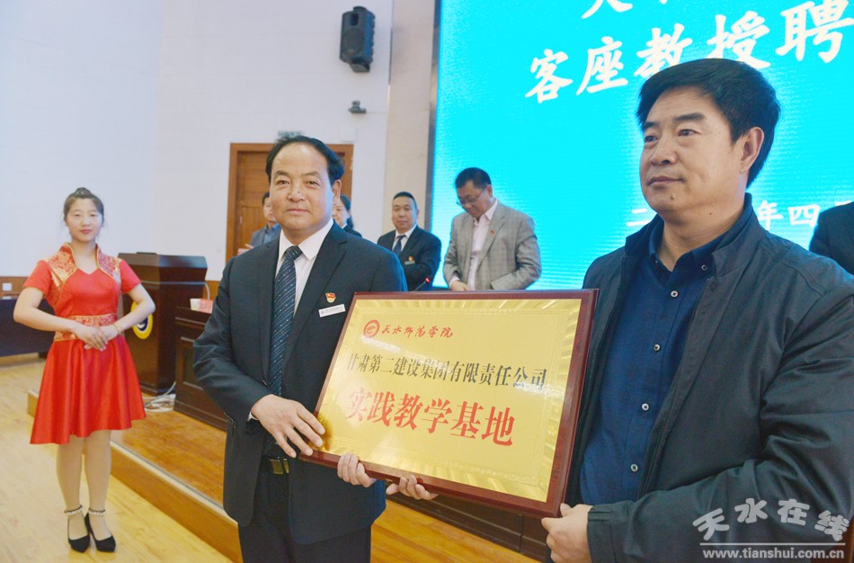 (王春景為學(xué)校頒發(fā)了甘肅二建集團(tuán)實(shí)踐教學(xué)基地牌匾)