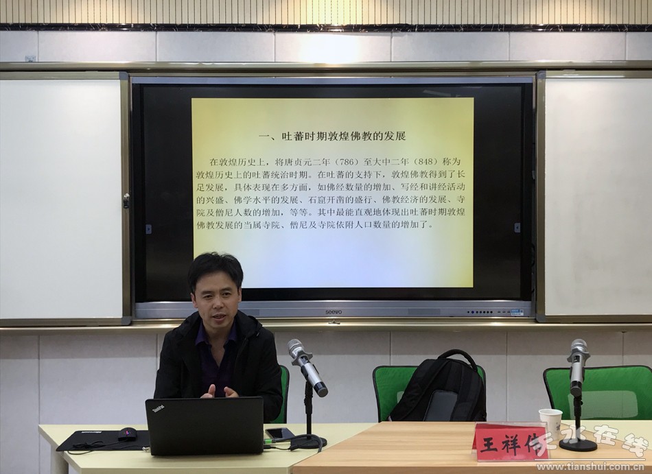 王祥偉對吐蕃對敦煌佛教的管制提出了新的觀點,著力從吐蕃時期敦煌佛教的發(fā)展、吐蕃對敦煌佛教的管制、控制寺院經(jīng)濟等方面作了細致的講解,并列舉了大量漢、藏文珍貴史料。郭永利展示了大量的考古新發(fā)現(xiàn),如靜寧新出元代壁畫墓,隴西、會寧、蘭州等地的壁畫墓等,并詳細梳理出對墓室壁畫斷代的若干標準,極大地開拓了在座師生的學(xué)術(shù)視野。講座期間,各位評議人、與談人就講座內(nèi)容與報告人進行了充分溝通和熱烈討論,有力推進了對相關(guān)學(xué)術(shù)前沿觀點的認識。