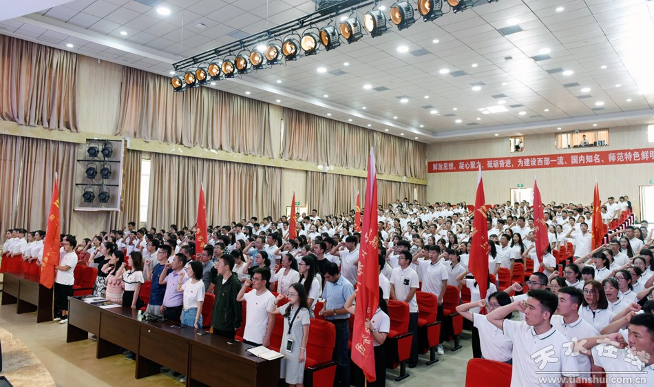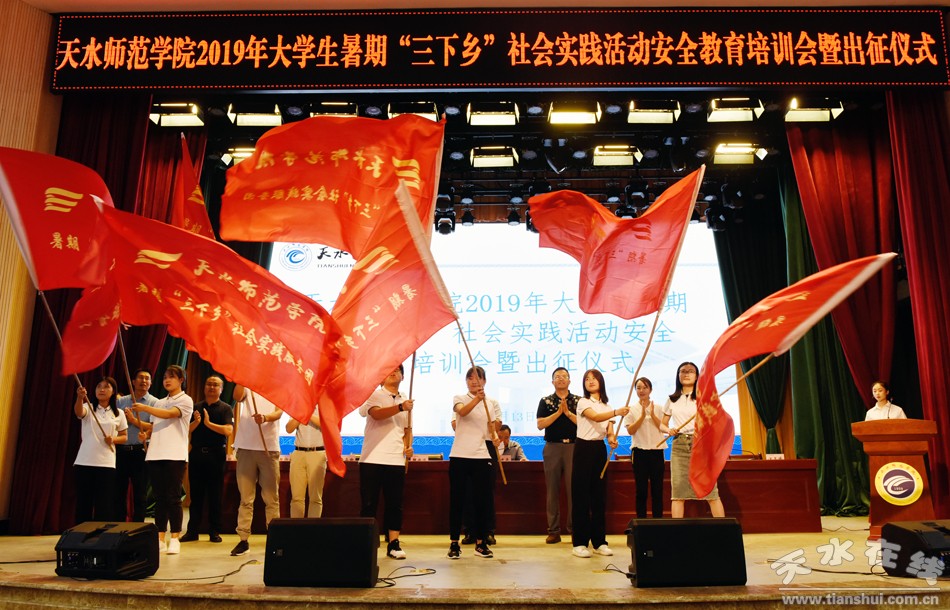 會上,校團委負責人宣讀了《關于開展2019年天水師范學院大學生暑期“三下鄉(xiāng)”社會實踐活動通知》和《天水師范學院大學生志愿者暑期“三下鄉(xiāng)”社會實踐文明公約》。學生工作處和黨委宣傳部負責人就如何做好社會實踐活動期間的安全和宣傳工作作了輔導。與會領導為各實踐團隊授旗,志愿者代表領讀了志愿者誓詞。