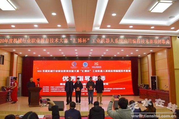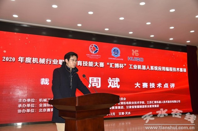 12月13日上午,2020年度機械行業(yè)職業(yè)教育技術大賽“匯博杯”工業(yè)機器人系統(tǒng)應用編程技術賽項閉幕式在學院信息樓多功能廳舉行。北京賽育達科教有限責任公司副總經(jīng)理耿東川,江蘇匯博機器人技術股份有限公司副總裁崔曉輝,中職組大賽專家組組長、蘭州城市學院、機械工程學院院長同長虹,中職組大賽裁判長、常州機電職業(yè)技術學院、電氣工程學院副院長周斌,江蘇匯博機器人技術股份有限公司市場與銷售部總監(jiān)孫曉默,學院黨委副書記趙彥軍出席閉幕式。大賽指導專家、裁判、領隊、參賽選手及學院師生代表共計120余人參加閉幕式。
