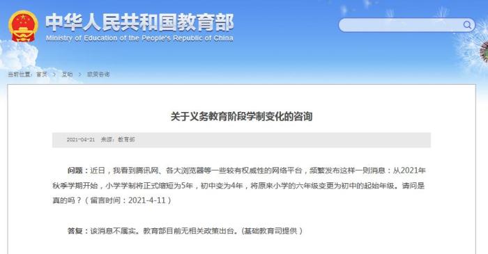 問(wèn)題:近日,我看到騰訊網(wǎng)、各大瀏覽器等一些較有權(quán)威性的網(wǎng)絡(luò)平臺(tái),頻繁發(fā)布這樣一則消息:從2021年秋季學(xué)期開(kāi)始,小學(xué)學(xué)制將正式縮短為5年,初中變?yōu)?年,將原來(lái)小學(xué)的六年級(jí)變更為初中的起始年級(jí)。請(qǐng)問(wèn)是真的嗎?