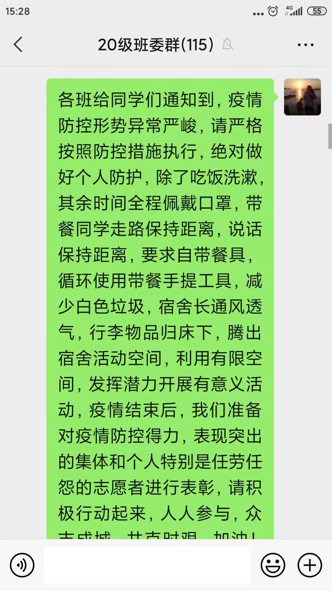 針對(duì)學(xué)生防疫政策學(xué)習(xí)不透、領(lǐng)會(huì)精神不深,線上聽課被動(dòng)敷衍現(xiàn)象,他申請(qǐng)進(jìn)入每個(gè)班級(jí)微信群,帶著疫情防控政策和學(xué)院疫情防控底線,手握“戒尺”,心懷“戒懼”,把一條條感人肺腑的抗疫故事和滿滿的正能量用文字注入,既鏗鏘有力又潤(rùn)物無(wú)聲。在課堂,宿舍長(zhǎng)打卡聽課狀態(tài),他隨時(shí)進(jìn)入線上聽課,巡查盤問,一個(gè)不漏,委婉巧妙地維持學(xué)生線上教學(xué)秩序。