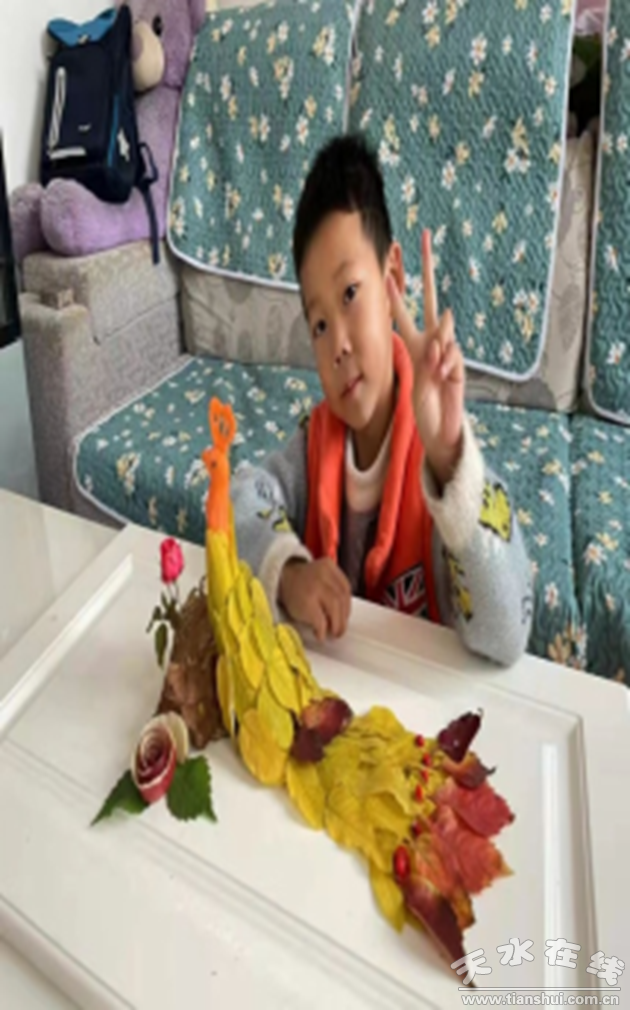 用樹(shù)葉制作孔雀,一(4)班張浩然同學(xué)正在做手工成功啦!