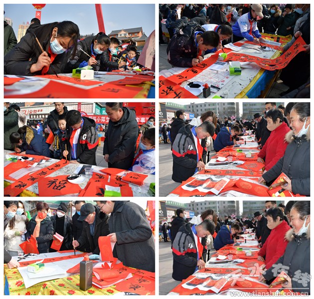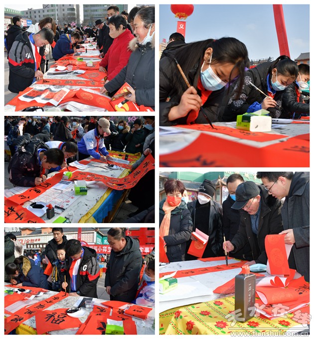 臨近年節(jié)的興國廣場人流如潮,十分熱鬧,83名師生在廣場揮毫寫春聯(lián),送祝福,活動長達(dá)3個小時,吸引了上千名群眾前來觀賞,送出對聯(lián)700余副,許多群眾因為人多沒有領(lǐng)到對聯(lián)。