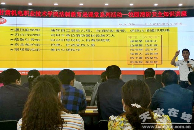 6月1日下午,甘肅機(jī)電職業(yè)技術(shù)學(xué)校邀請(qǐng)政安消防專業(yè)人員在校法制教育基地開(kāi)展校園消防知識(shí)講座,學(xué)生宿舍樓管理人員、各二級(jí)學(xué)院專兼職輔導(dǎo)員、機(jī)械工程學(xué)院學(xué)生代表等聆聽(tīng)了講座。講座之后開(kāi)展了應(yīng)急疏散演練。