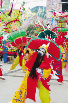 蘭州軍儺隊(duì)表演的漢將霍去病大將軍當(dāng)年出征前的祭祀活動(dòng),場面壯觀,陣營強(qiáng)大,受到專家和學(xué)者的高度評(píng)價(jià)。永靖三峽藝術(shù)團(tuán)表演的儺舞“三皇鼓舞”集古今藝術(shù)為一體,在創(chuàng)新上獨(dú)具風(fēng)格,使儺文化藝術(shù)推陳出新,觀眾掌聲叫絕。江西南豐石郵儺舞代表隊(duì)表演了當(dāng)?shù)亓鱾鞯膬珒,老夫少妻老年得貴子,兩人恩愛的生活場景。永靖三源代表隊(duì)表演的“莊稼老”充滿了泥土氣息,具有濃厚的生活情趣。